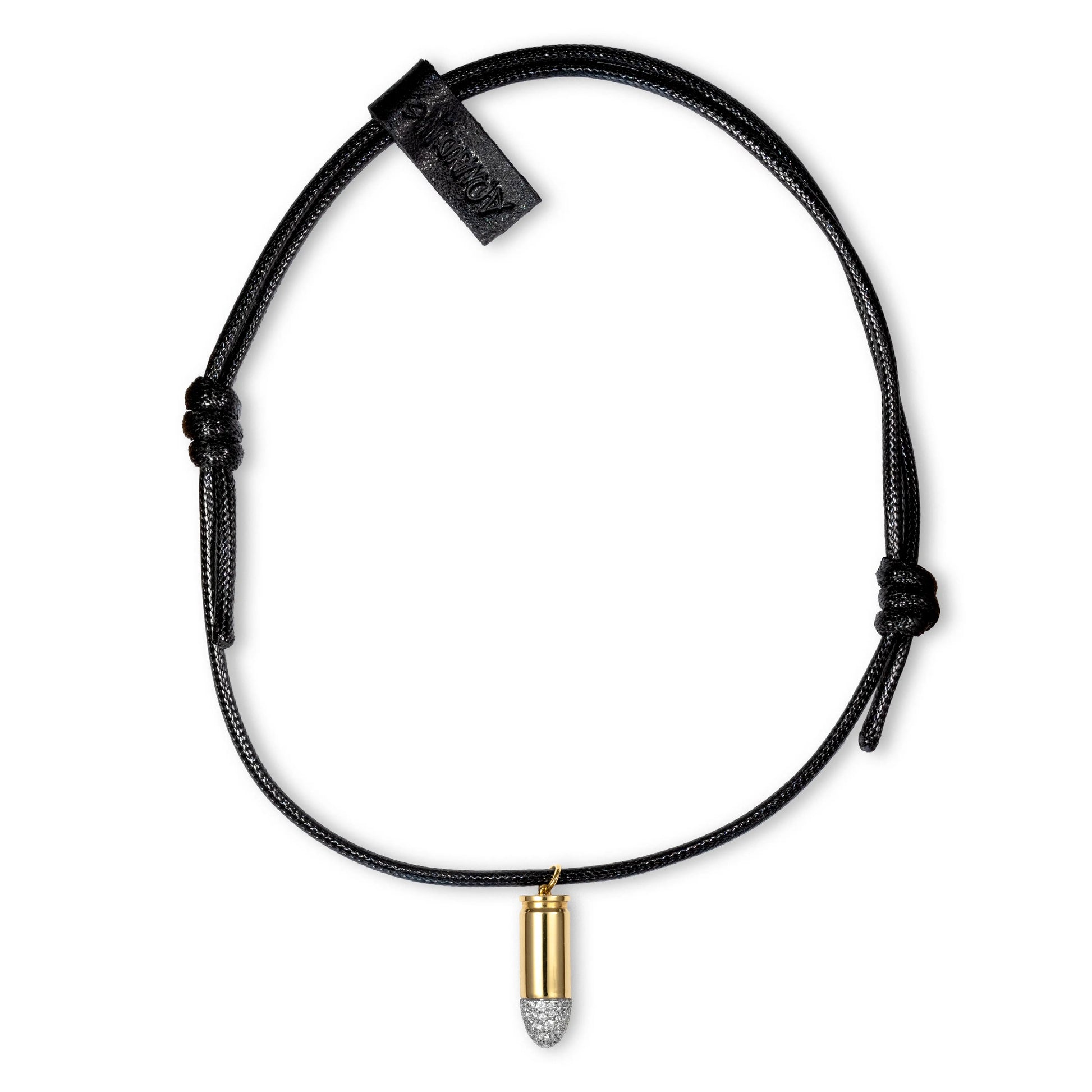 Solid 18k yellow gold hand-set with natural diamonds. A symbol of rebellion against your own condition. Set on a 3 mm waxed cord. Cowhide leather tag, hot-stamped. Adjustable sliding knot. Made by humans. Ready to use.